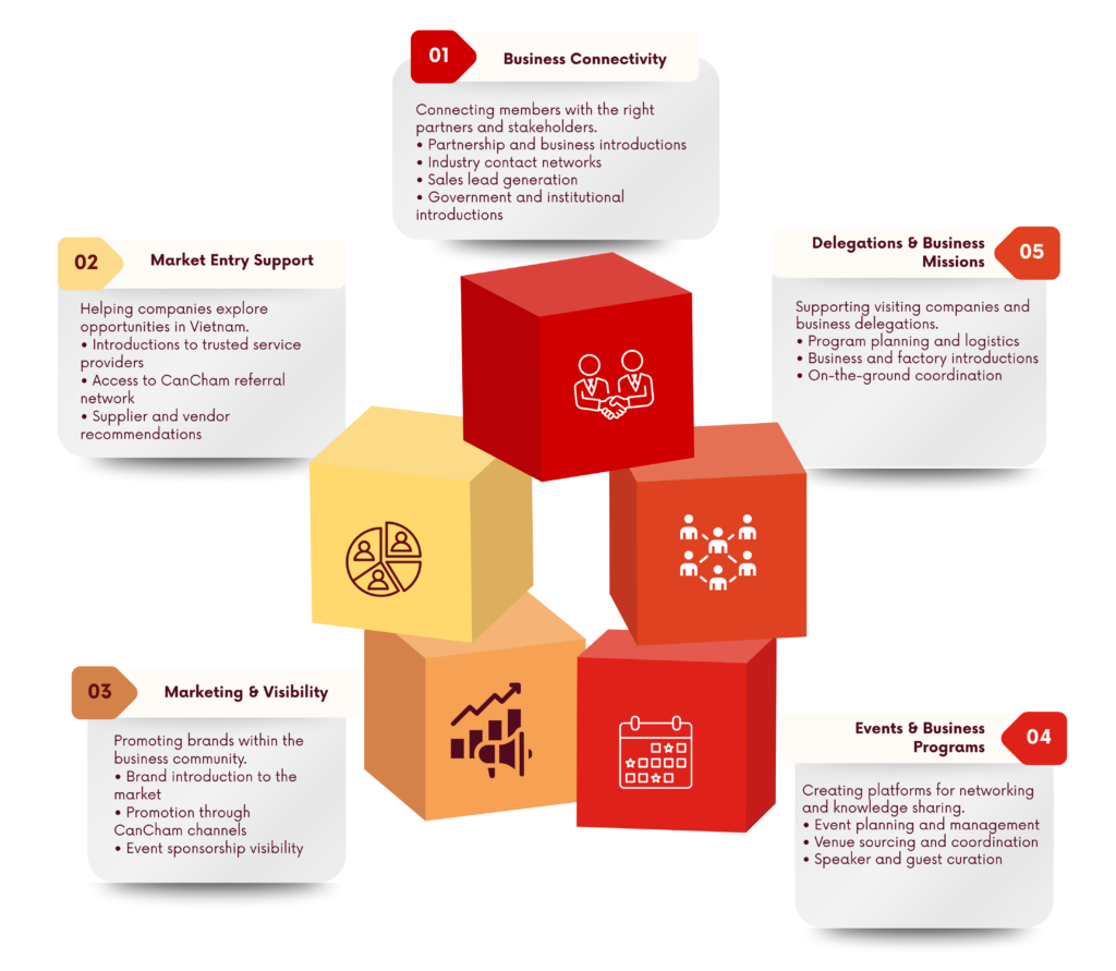 As part of its mission to strengthen business engagement between Canada and Vietnam, CanCham continues to develop a range of business support services designed to help companies connect, explore opportunities, and navigate the local market.