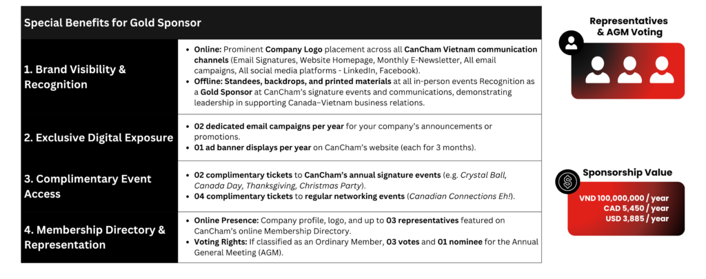 Gain strategic access to CanCham’s network, premium exposure across platforms, and leadership opportunities that drive collaboration and long-term success in both Canada and Vietnam.