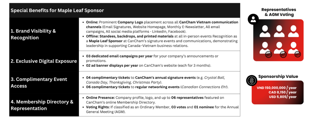 Becoming a Maple Leaf Sponsor places your company among a select group of leaders driving Canada–Vietnam trade and investment. This partnership enhances your brand visibility through CanCham’s exclusive network, events, and communications — giving your company a stronger voice along with online and offline presence within the business community.